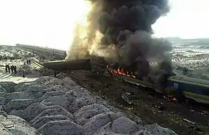 The accident happened when an express train going from Tabriz to Mashhad stopped because of technical problems associated with cold weather between Semnan and Damghan. The second express train, which was travelling from Semnan to Mashhad on the same track, was ordered to stop by the dispatcher, and the signals turned red. The shift for the dispatcher changed before the technical problems with the first train were resolved. The second train asked for permission to resume its journey which was then approved by the new dispatcher. The second train reached full speed, and, at 7:50 AM, hit the stopped express train from behind.[4] As a result of the collision, four carriages were derailed, two of which caught fire. Forty-seven passengers and crew from both trains were reported dead, and more than 100 were reported injured.[5][6] The injured were airlifted to hospitals in Semnan and Damghan.[5][7][8]