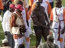 It takes its root from the wrestling tradition of the Serer people - formally a preparatory exercise for war among the warrior classes depending on the technique.[4][5] In Serer tradition, wrestling is divided into different techniques with mbapate being one of them. It was also an initiation rite among the Serers, the word Njom derives from the Serer principle of Jom (from Serer religion), meaning heart or honour in the Serer language.[6][7] The Jom principle covers a huge range of values and beliefs including economic, ecological, personal and social values. Wrestling stems from the branch of personal values of the Jom principle.[6] One of the oldest known and recorded wrestler in present-day Senegal[8] was Boukar Djilak Faye (a Serer) who lived in the 14th century in the Kingdom of Sine. He was the ancestor of the Faye Paternal Dynasty of Sine and Saloum (both Kingdoms in present-day Senegal).[9] The njom wrestling spectacle was usually accompanied by the kim njom - the chants made by young Serer women in order to reveal their gift of "poetry" (ciid in Serer[10] ). The Wolof word for wrestling - Laamb, derives from the Serer language Fara-Lamb Siin (Fara of Mandinka origin whilst Lamb of Serer origin) the chief griot who used to beat the tam-tam of Sine called Lamb or Laamb in Serer.[11] The lamb was part of the music accompaniment of wrestling in pre-colonial times as well as after Senegal's independence. It was also part of the Njuup tradition (a conservative Serer music repertoire, the progenitor of Mbalax[12][13][14]).