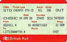 12 May 1985 saw changes to the range of fares which received discounts, and in some cases to the level of the discounts, in respect of the "full" version of the Railcard (which by now cost £12.00). The "Day Returns Only" Railcard still gave 50% discounts on those fares, but the full version now gave only a 34% saving on Standard Single and Return fares and the new off-peak Saver tickets. ("Standard" was the new name for the former "Ordinary" category of ticket, being the highest priced and least restricted. These are now known as "Open" tickets.) A 50% discount was now only available on Day Returns and the new off-peak equivalent, the Cheap Day Return.[4] Further restrictions on journeys by ferry and ship were made in 1985 and 1986, while Rover and Ranger tickets of all types ("go-anywhere" multi-journey tickets covering particular geographic areas) were included within the discount scheme from May 1987, with a saving of 34% available for Railcard holders.[6]