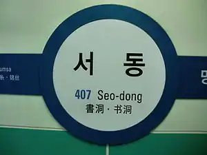 Seo-dong Station (Korean: 서동역; Hanja: 書洞驛) is an underground station of the Busan Metro Line 4 in Seo-dong, Geumjeong District, Busan, South Korea.