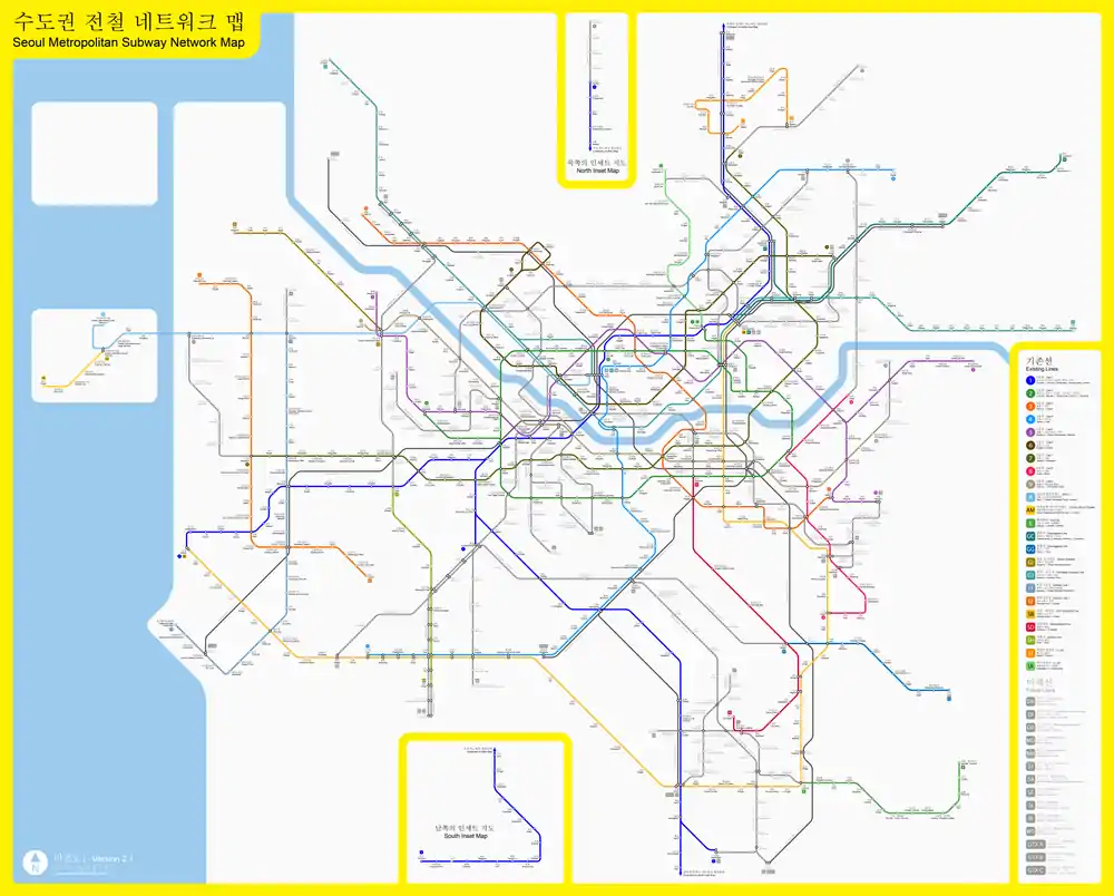 The Byeongjeom-Seodongtan extension of Line 1 opened on 26 February 2010, and the Gyeongchun Line opened on 21 December. On 28 October 2011, the Shinbundang Line from Gangnam station to Jeongja station opened. The Suin Line, from Oido station to Songdo station, opened on 30 June 2012. The U Line opened on 1 July, the Onsu-Bupyeong-gu Office extension of Line 7 on 27 October and the Gongdeok-Gajwa extension of the Gyeongui Line on 15 December. On 26 April 2013 EverLine opened, and the Gyeongui·Jungang Line opened on 27 December 2014. The Sinnonhyeon-Sports Complex extension of Line 9 opened on 28 March 2015. On 30 January 2016 the Jeongja-Gwanggyo extension of the Shinbundang Line opened, followed by the Songdo-Incheon extension of the Suin Line on 27 February. Incheon Subway Line 2 opened on 30 July, and the Gyeonggang Line on 24 September. The Gyeongui-Jungang Line is extended one station east to Jipyeong station on 21 January 2017, with 4 round trips to Jipyeong station. On 16 June 2018 the Seohae Line opened. Magongnaru station on Line 9 became an interchange station with AREX on 29 September 2018.[20] Bundang line is extended northeastward to Cheongnyangni station, allowing for connections to the Gyeongchun Line and regional rail services on 31 December 2018. On 28 September 2019, the Gimpo Goldline opened as the newest line in the Seoul Metropolitan Subway system[21]