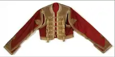 The Montenegrin cap is a traditional cap worn by Montenegrins and Montenegrin Serbs, originally in the shape of a flat cylinder, having a red upper surface (called tepeluk) not dissimilar to the Herzegovina and Lika caps. It was wholly red until Prince-Bishop Petar II Petrović Njegoš surrounded it with a black rim (called derevija),[22] and the definition given was as a sign of grief of occupied Kosovo. The Kosovo Myth was very popular in the Prince-Bishopric of Montenegro. The enforcement of the cap upon the Montenegrin chieftains by Peter II was a mark of expression of then's dominating Serbian national identity.[23] The national telling recorded the most often version of the cap as following: the black wrapper was sign of grief for the once big Empire, the red the bloody defeat at the Battle of Kosovo[24] and the five small stripes on the top represent the remaining remains of the once greater Serbian realm,[25] which became increasingly popular amongst the common folk during the reign of Prince Danilo I Petrović-Njegoš. Within the stripes is angled a six star, representing the last free part, Montenegro, shining upon the fallen and conquered.[26] Worn by the rulers and chieftains, the version with the Four Ocil symbol in the star's place had become across the years with growth of nationalism excessively popular amongst the ordinary people, the symbol of the Serbian Orthodox Church, which effectively worked on maintaining and raising the national identity.