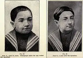 His first official transplantation of a monkey gland into a human took place on June 12, 1920.[17] Thin slices (a few millimetres wide) of testicles from chimpanzees and baboons were implanted inside the patient's scrotum, the thinness of the tissue samples allowing the foreign tissue to fuse with the human tissue eventually.[17] By 1923, 700 of the world's leading surgeons at the International Congress of Surgeons in London, England, applauded the success of Voronoff's work in the "rejuvenation" of old men.[18]