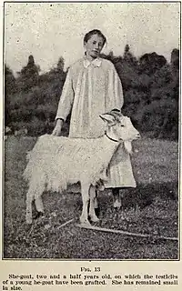 Between 1917 and 1926, Voronoff carried out over five hundred transplantations on sheep and goats, and also on a bull, grafting testicles from younger animals to older ones. Voronoff's observations indicated that the transplantations caused the older animals to regain the vigor of younger animals.[15] He also considered monkey-gland transplantation an effective treatment to counter senility.[16]