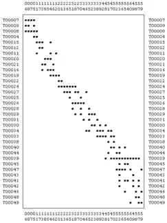 The data presented in this example was simulated by WinBasp. Initially 60 contexts (called units in WinBasp) were created along with 50 types. The contexts were labeled in chronological order by numbers 01 to 60, the types are labeled in the form T00001 to T00050. If a type is represented by one object only this object is not relevant for the chronological sequence as it does not provide a link to another context. Similarly, contexts containing one object only are irrelevant for seriation. Therefore, the contexts with one or no object and types represented by one object or not at all were eliminated. The resulting raw simulated data consisting of 43 contexts and 34 types are shown on the left. As expected, the dots indicating the occurrence of a type in a context are close to the diagonal of the table.