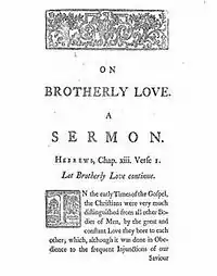 "On Brotherly Love" was given on 29 November 1717.[45] Its introductory passage from scripture comes from Hebrews 8:1 – "Let brotherly love continue."[46]