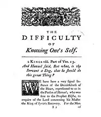 Although "On the Difficulty of Knowing One's Self" was printed in 1745 along with some of Swift's other sermons, its authorship is not completely established, since the original printing of the work came with the following disclaimer: