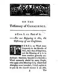"On the Testimony of Conscience" was first printed in 1744.[35] Its introductory passage from scripture comes from 2 Corinthians 1:12 – "For our rejoicing is this, the testimony of our conscience."[36] Part of the sermon relied on discussing the nature of rewards and punishments to come in the afterlife.[37]