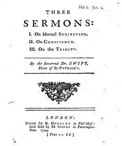 Jonathan Swift, as Dean of St. Patrick's Cathedral in Dublin, produced many sermons during his tenure from 1713 to 1745.[1] Although Swift is better known today for his secular writings such as Gulliver's Travels, A Tale of a Tub, or the Drapier's Letters, Swift was known in Dublin for his sermons that were delivered every fifth Sunday. Of these sermons, Swift wrote down 35, of which 12 have been preserved.[2] In his sermons Swift attempted to impart traditional Church of Ireland values to his listeners in a plain manner.[2]