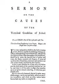 The sermon is properly titled "A Sermon on the Wretched Conditions of Ireland".[60] Its introductory passage from scripture comes from Psalms 144: 14–15 – "That there be no complaining in our streets. Happy is the people that is in such a case."[61]