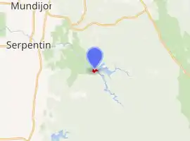 The Serpentine Dam catchment is situated in the Darling Plateau within the Darling Scarp, on Kingsbury Drive, around 12 kilometres (7.5 mi) south of Jarrahdale, Western Australia.[5] It forms part of the Archaean Shield covered by open woodland and private land areas that have been cleared for rural and agricultural purposes.[3]