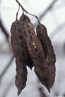 The deciduous leaves are alternate and compound. Between five and 20 pairs of elliptical leaflets occur on a single stalk. The leaf margins are commonly entire, with little or no serration. Each leaflet is oblong and ends in a pointy tip. The leaves contain stipules that are usually inconspicuous. The flowers and fruits droop at the tips of the stalks. The branches of this shrub are rather thin, and green, but turn a darker red brown when they mature. The bark varies from gray brown to red brown with obvious horizontal lenticels.[6][9][10]