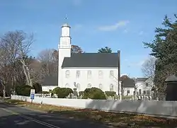 The church was built in 1812 in the Federal style and is a three-by-five-bay, heavy timber framed, 38-by-40-foot (12 by 12 m) building sheathed in wood shingles and covered by a gable roof. The center bay features an 11-by-8-foot (3.4 by 2.4 m) bell tower / narthex. The burial ground was established in the 1660s and contains approximately 800 gravesites.[2] The church grounds were the site of a Loyalist fortification that was attacked by Continental Army forces from Connecticut in August 1777.