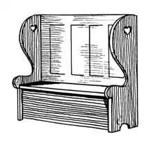 A settle is a wooden bench, usually with arms and a high back, long enough to accommodate three or four sitters.[1]