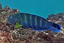 The seven-banded wrasse (Thalassoma septemfasciata) is a species of ray-finned fish, a wrasse from the family Labridae which is endemic to the Indian Ocean waters of Western Australia. This species is known to occur on reefs in areas with plentiful rocks and weeds. It can reach 31 cm (12 in) in total length.[2]
