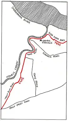 In reality, there used to be a road in Hellam Township named Toad Road, however it was wiped off the map after Hurricane Agnes in 1972. Toad Road ran along the Codorus Creek and led to the Codorus Furnace. Today, there are multiple gates on this property; which is privately owned. Trespassers can be arrested and prosecuted.[3] The gates associated with this legend can be found alongside Range Road and end at the old intersection between Trout Run, Range and Toad Road. All can be seen day or night, contrary to what the legend says. The dense wooded area, known as Trout Run, contains the ruins of a flint mill (likely mistaken for a burnt-down asylum).