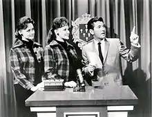 ![]() Host Jack Narz with twin contestants. | |