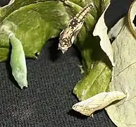 The full-grown larvae attach their rear ends to a leaf or branch with a small patch of silk and hang with their heads down. After about a day or so, they shed their skin to reveal a pupa.