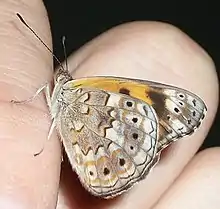 The wingspan of Boisduval's tree nymph is 40–45 mm.[2] The upper surface of the wings of the male are uniform dark brown, with small dark spots near the fringe of the hindwings. The female has an overall lighter brown colour on the upper surface, and orange-brown markings near the tips of the forewings. The dark spots near the fringe of the hindwings are more pronounced in females. The undersurface of the hindwings of both sexes are variegated grey and brown, and have an arc of seven dark spots encircled firstly by a greyish ring, and then an orange-brown ring. The undersurface of the forewing is orange brown with a row of four black spots near the tip. The female forewing also has two dark brown bands.