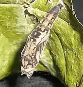 After shedding its skin, the pupa hardens and remains in a fairly rigid position. However the pupa can twist from side to side when disturbed. The pupae are variable in colour; being green, or creamy brown with small dark markings, or brownish and dark patterned. The pupa takes about ten days to mature and hatch into a butterfly.