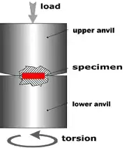 High pressure torsion (HPT) can be traced back to the experiments that won Percy Bridgman the 1946 Nobel Prize in Physics, though its use in metal processing is considerably more recent. In this method, a disk of the material to be strained is placed between 2 anvils. A large compressive stress (typically several gigapascals) is applied, while one anvil is rotated to create a torsion force. HPT can be performed unconstrained, in which the material is free to flow outward, fully constrained, or to some degree between in which outward flow is allowed, but limited.[4]