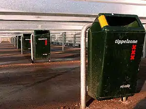 The concept started in the Netherlands where such facilities are called afwerkplek (literally meaning "a place to finish the work"; more to the point, "a sheltered area, provided by the authorities, where prostitutes provide their services"[1]), and was first used in Utrecht starting in 1986.[2][3] It was later adopted in Germany (Verrichtungsbox in German, which translates somewhat as "effectuation box" but with a hint of banality and mundaneness), where the Utrecht model was first used in Cologne in 2001. There, a football field-sized, fenced-in space of a former industrial area (typically the kind of area where there are no residents to complain about the location), with a gated entry, security cameras, and alarm buttons in each stall.[4][5]