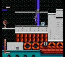 The player can run, crouch, climb ladders, attack, and jump like in most side-scrolling action games as well as hang onto an overhang and move under it.[5] If the player has more than half of their vitality remaining, they can perform a special attack by holding a button for an extended period, summoning a thunderstorm that will damage all on-screen enemies, but at the cost of roughly half of their maximum vitality.