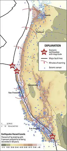 ShakeAlert is an earthquake early warning system (EEW) in the United States, developed and operated by the United States Geological Survey (USGS) and its partners.[1] As of 2021, the system issues alerts for the country's West Coast (specifically the states of California, Oregon and Washington). It is expected that the system will be expanded to other seismically active areas of the United States in the future.