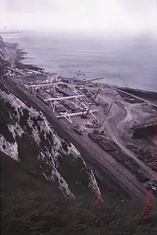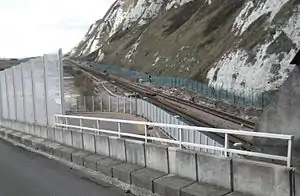 For some years a watchman was based at the station and a zig-zag path was provided to give access from the top of the cliff.[6] The British Army used the station during the Second World War to serve a nearby military camp, and medical staff are also recorded as having used the halt in the post-war period.[5] Shakespeare Cliff Halt was given a new lease of life when work began again on the abortive Channel Tunnel of that time. Workmen carrying out preliminary work used the halt between November 1973 and January 1974, and it was used again in the early 1990s during the actual construction of the Channel Tunnel. At that time, the up platform was rebuilt and lengthened, and a substantial timber footbridge was built across the rail tracks, with offices on the bridge. Special season tickets were issued by British Rail for people involved in constructing the Tunnel.[7] The last use of the halt was by those constructing Samphire Hoe Country Park on the site of the Tunnel workings.