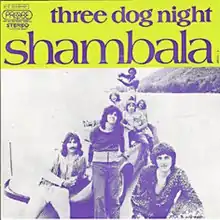 The well-known cover version of this song by the rock band Three Dog Night appeared in 1973 on the Billboard Hot 100, on the top 40 from the beginning of June through the end of August, reaching No. 3 in both the pop singles and adult contemporary categories,[3] No. 1 on the Cashbox Magazine charts,[4] and an isolated week at No. 1 on WLS.[5] Headed toward the Hot 100's summit in late July, had it not run out of steam, "Shambala" would have completed an uncommon distinction of a Hot 100 chart-topper for each of four consecutive years for the group. The song, the first one that the group had specifically cut as a single, rather than an album cut,[6] later appeared on Cyan, Three Dog Night's ninth album, and subsequently on numerous anthologies and compilation albums.[3][7]