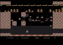 The third type of room is where the majority of the game time takes place. Here the player walks back and forth along the bottom while firing his plasmar detonators upward into the room. At the top of the room are alternating layers of enemies travelling horizontally, which can be attacked with the detonators. Periodically, waves of these enemies leave the horizontal rows and descend into the center of the room, where they are much easier to attack, but can also fire back at Shamus, or collide with him. The detonators are not used up when they hit an enemy, and continue to bounce around the screen like small rubber balls. If these make it to the top, they can get above the rows of enemies and bounce repeatedly, as in the game Breakout.[4]