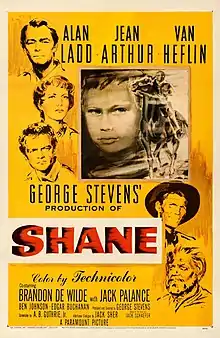 Shane is a 1953 American Technicolor Western film starring Alan Ladd, Jean Arthur and Van Heflin. Released by Paramount Pictures,[4][5] the film is noted for its landscape cinematography, editing, performances, and contributions to the genre.[6] The picture was produced and directed by George Stevens from a screenplay by A. B. Guthrie Jr.,[7] based on the 1949 novel of the same name by Jack Schaefer.[8] Its Oscar-winning cinematography was by Loyal Griggs.
