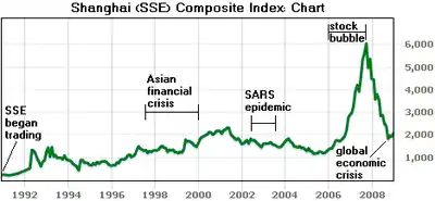 - 2007-2008 - A "stock market frenzy" as speculative traders rush into the market, making China’s stock exchange temporarily the world's second largest in terms of turnover.[15][16] After reaching an all-time high of 6,124.044 points on October 16, 2007,[17] the benchmark Shanghai Composite Index ended 2008 down a record 65%[18] mainly due to the impact of the global economic crisis which started in mid-2008.
