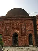 It is a one-storey building. The building has the same length and width which is 21 ft and 6in. The width of the verandah is slightly above 3 ft wide. It has four domes. It has one large dome on the main building and three smaller domes on the verandah. There are 15 doors and windows, almost equal in size. The thickness of the walls are all roughly 5 ft apart from the western wall which is about 10 ft. It has six decorative pillars in the four corners of the main hall and two corners of the verandah. There is a large pond behind the mosque.[5] The mosque has three doorways, with the middle one much larger than the others.[6] There is a minaret separate from the mosque which is not extremely tall.