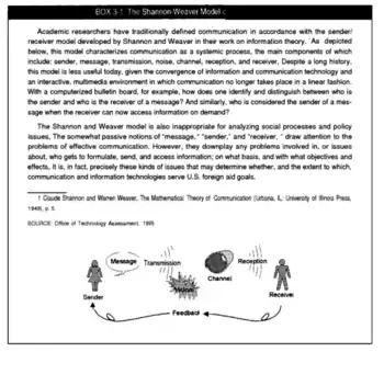 The Shannon–Weaver model of communication has been called the "mother of all models."[2] Social Scientists use the term to refer to an integrated model of the concepts of information source, message, transmitter, signal, channel, noise, receiver, information destination, probability of error, encoding, decoding, information rate, channel capacity. However, some consider the name to be misleading, asserting that the most significant ideas were developed by Shannon alone.[3]