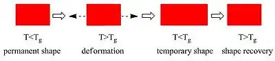 While most traditional shape-memory polymers can only hold a permanent and temporary shape, recent technological advances have allowed the introduction of triple-shape-memory materials. Much as a traditional double-shape-memory polymer will change from a temporary shape back to a permanent shape at a particular temperature, triple-shape-memory polymers will switch from one temporary shape to another at the first transition temperature, and then back to the permanent shape at another, higher activation temperature. This is usually achieved by combining two double-shape-memory polymers with different glass transition temperatures[9] or when heating a programmed shape-memory polymer first above the glass transition temperature and then above the melting transition temperature of the switching segment.[10][11]