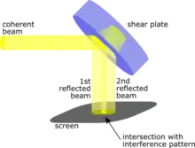 The shearing interferometer is an extremely simple means to observe interference and to use this phenomenon to test the collimation of light beams, especially from laser sources which have a coherence length which is usually significantly longer than the thickness of the shear plate (see graphics) so that the basic condition for interference is fulfilled.