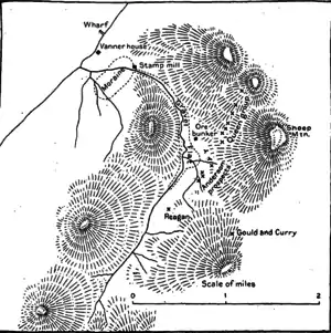 The formations of Gold Creek extend without interruption southeastward to Taku Inlet, but only the two outer divisions—namely, the black slate and the group of green stones and intercalated slate—are cut by Sheep Creek. On the ridge between Gold and Sheep creeks, the band of slates with their intrusive dikes of dark diorite is about 6,800 feet (2,100 m) across and this width is only slightly diminished in the vicinity of the Grindstone Creek divide, 3.5 miles (5.6 km) distant. The black slates contain dikes of dark diorite (altered gubbro), which follow the general trend of the formation. However, these rocks have not been greatly affected by vein waters. On the southeast ridge of Sheep Mountain and extending southeastward for 1.5 miles (2.4 km) is a somewhat irregular dike of the Coast Range-type of diorite. This rock has been impregnated to a certain extent by sulphides and locally contains stringers of quartz. This intrusion cuts a dike of the dark diorite.[2]