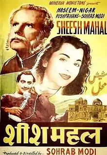 Sheesh Mahal (Palace of Mirrors) is a 1950 social Urdu/Hindi film produced and directed by Sohrab Modi for Minerva Movietone. The story writer was the late Khan-Bahadur Hakim Ahmad Shuja, an Urdu poet and writer. The screenplay and dialogue were by Munshi Abdul Baqui and Shams Lucknawi.[1] The music direction was by Vasant Desai and the lyricists were Aajiz, Shams Lucknowi and Nazim Panipati.[2] The film starred Sohrab Modi, Naseem Banu, Mubarak, Pran, Nigar Sultana, Pushpa Hans, Jawahar Kaul and Leela Mishra.[3]