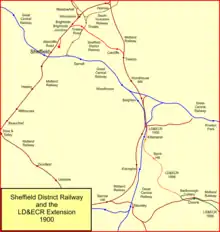 The Sheffield District Railway was a 3+1⁄2-mile (6 km) railway line in South Yorkshire, England. It was built to give the Lancashire, Derbyshire and East Coast Railway access to Sheffield, primarily for goods traffic, for which a large goods depot at Attercliffe, in Sheffield, was built. The construction was sponsored by the LD&ECR and the Great Eastern Railway together, with the support of the Midland Railway, which agreed running powers over sections of its own lines. The Sheffield District Railway opened in 1900. The LD&ECR operated the passenger service, although the Midland Railway later ran passenger trains too. The SDR did not have rolling stock and did not operate trains itself. The LD&ECR was absorbed by the Great Central Railway in 1907, and the GCR inherited the LD&ECR running powers.