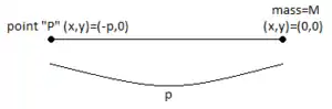 Suppose that this mass is evenly distributed in a ring centered at the origin and facing point with the same radius . Because all of the mass is located at the same angle with respect to the x-axis, and the distance between the points on the ring is the same distance as before, the gravitational field in the x-direction at point due to the ring is the same as a point mass located at a point units above the y-axis:
