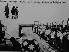 During the Islamic rebellion, Sheng launched his own purge in Xinjiang to coincide with Stalin's Great Purge.[68] Sheng started the elimination of "traitors", "pan-Turkists", "enemies of the people", "nationalists" and "imperialist spies". His purges swept the entire Uyghur and Hui political elite.[69] The NKVD provided the support during the purges.[68] In the later stages of the purge, Sheng turned against the "Trotskyites", mostly a group of Han Chinese sent to him by Moscow.[70] In the group were Soviet General Consul Garegin Apresov, General Ma Hushan, Ma Shaowu, Mahmud Sijan, the official leader of the Xinjiang province Huang Han-chang, and Hoja-Niyaz. Xinjiang came under virtual Soviet control.[68] It is estimated that between 50,000 and 100,000 people perished during the purge.[70]