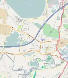 This neighbourhood is smaller than the adjoining village, separated by the M3 motorway and some adjoining meadows and fields. The second of the borough's Green Belt SSSIs, Sheep Walk Meadows, is a key feature of Shepperton Green, bounding it, to its south. A Saxon and medieval burial ground gives its name to the Saxon Junior School who use it for playing fields and has Scheduled status.[33] A farm combined with a significant amount of fishing and gravel lakes form the outskirts and within the clustered settlement an estate of the homes was built as non-serving personally barracks for the British Army.[34]