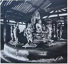 The 191.5 cm, Heian period seated Yakushi Nyorai is the principal image of Shin-Yakushi-ji. He is placed on a huge (9 m diameter, 90 cm high) circular platform (Dais) which almost entirely fills the Hon-dō.[7] Together with six small Buddha images (化仏, kebutsu) on its halo, the main statue forms a group of Seven Buddhas of Healing (七仏薬師, shichibutsu yakushi). Yakushi Nyorai is protected by Twelve Heavenly Generals arranged in a circular fashion around it facing outward.