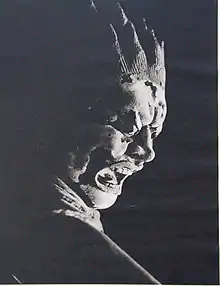 The present image is probably not one of those that had been installed in the original Kon-dō and were made in a hollow dry lacquer (脱活乾漆造, dakkatsu kanshitsu zukuri) technique. However, there are conflicting theories concerning the origin of the present statue. It might have been carved in 793 together with the reconstruction of the temple after fire damage.[8] Generally it is considered to be a work of the end of the 8th century and a good representative example of early Heian period wooden sculptures. It is cut from a single Hinoki tree and neither paint nor lacquer have been applied to the wood except for some colour to indicate facial features. Distinctive are the protuberant lips, well defined curls and large nose. The eyebrows painted in black are narrow and acute. His right arm is lifted showing the Mudra of no fear (Abhayamudra) while his left arm rests on his leg with the palm of his hand turned up holding a medicine pot.