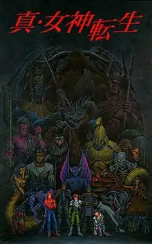 ![]() Super Famicom box art, featuring the main characters and multiple demons from the game | |