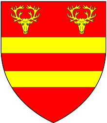 About 2 miles (3 km) southeast of the village is the farmhouse of Langley, a largely mid-19th-century building. It is on the site of a royal hunting lodge that was built for Henry VII. Most of the Tudor monarchs stayed there when hunting in Wychwood Forest.[2] King James I stayed at Langley in August 1605, and a French servant who died was buried at Shipton.[3] The de Langley family were hereditary keepers of Wychwood Forest, Oxon. The office carried with it the tenancy of the manor of Langley in Shipton-under-Wychwood parish.[4] The heir was Simon Verney (d. 1368) whose brother was William Verney of Byfield, Northants., father of Alice Verney, 1st. wife of John Danvers (d. 1449) of Calthorpe, MP for Oxfordshire 1420, 1421, 1423 and 1435.[5] The de Langley family held the manor of Shipton, Oxfordshire, and Richard Lee in his Gleanings of Oxfordshire of 1574 states that these arms of "Gules, 2 bars or in chief 2 buck's heads cabossed of the 2nd" were then displayed in a stained glass window in St. Mary's parish church at Shipton with a tomb under it. The buck's heads seem to be a reference to the de Langley office of forester of Wychwood.