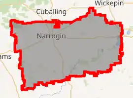 On 19 May 1892, the Narrogin Road District came into being. On 1 July 1961, it became a Shire under the Local Government Act 1960.[2] In 1999 and 2004, proposals to merge the Shire with the Town of Narrogin were defeated at referendum.[3] In 2016, on July 1, the Shire of Narrogin amalgamated with the Town of Narrogin. The new entity retained the designation of Shire.