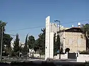 The 1949 Armistice Agreements put Shmuel HaNavi Street parallel to the Jordanian border, with a no man's land of barbed wire and minefields separating it from Ammunition Hill to the north.[10][11] From 1949 to 1967 the official crossing point between Israeli- and Jordanian-held territory stood at the eastern end of Shmuel HaNavi Street at a checkpoint called the Mandelbaum Gate. This checkpoint was named after the destroyed Mandelbaum House, whose ruins lay nearby.[6][12] Clergy, diplomats and United Nations personnel used the 50 yards (46 m)[13] gateway to pass through the concrete and barbed wire barrier between the sectors, but Jordanian officials allowed only one-way passage for non-official traffic. Anyone with an Israeli stamp in his or her passport was denied passage.[14]
