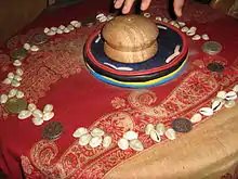 Two six-sided dice are used. They are placed in a wooden dice cup which is shaken and then slammed down onto a dice pad, typically made of. yak leather stuffed with yak wool, which forms the centre of the board, within the circle of shells.
